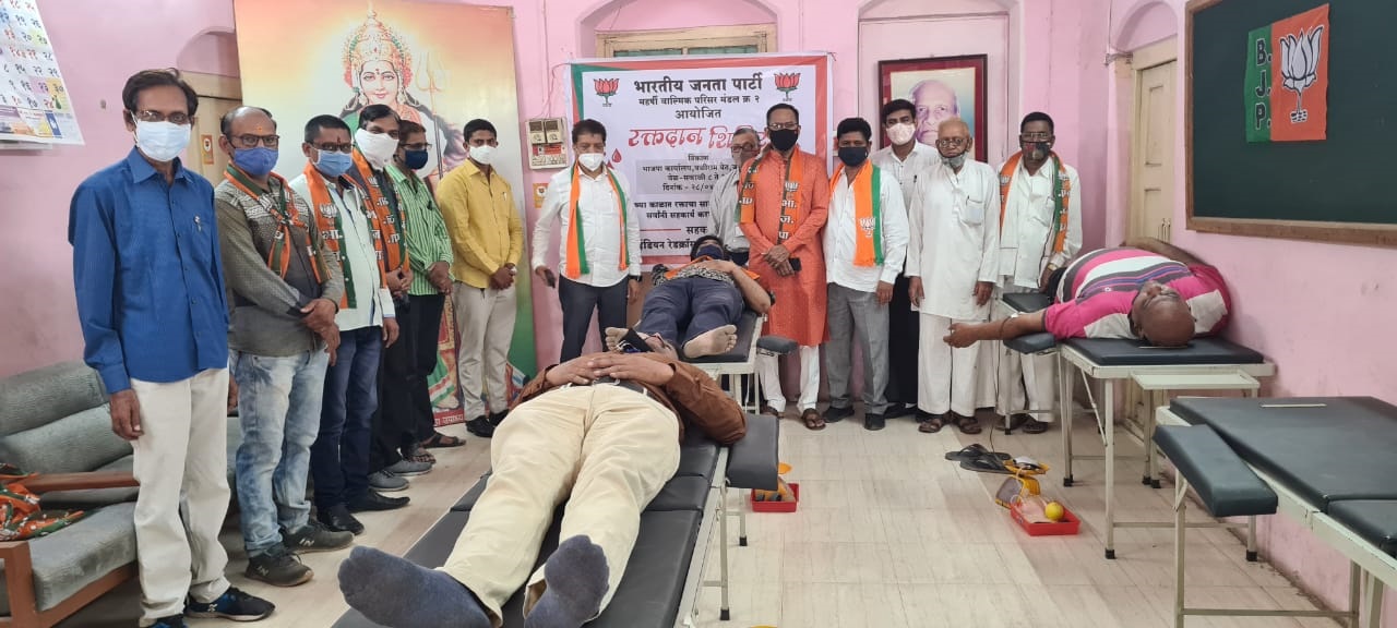 जळगाव, प्रतिनिधी : संपूर्ण देशात कोरोना प्रचंड प्रमाणात थैमान घातल्याने राज्यात रक्तपुरवठा कमि होत असल्याने भा ज पा प्रदेश कार्यालय नुसार संपुर्ण महाराष्ट्र हनुमान जयंती चे निमित्त रक्तदान शिबिर घेण्याचे सांगितले होते. त्यानुसार भाजपा जिल्हा महानगर अंतर्गत भाजपा मंडळ क्रमांक 6 व मं क्र 2, 3 येथे रक्तदान शिबीर व कोरोना अँटिजेंत टेस्ट शिबीर घेण्यात आले.