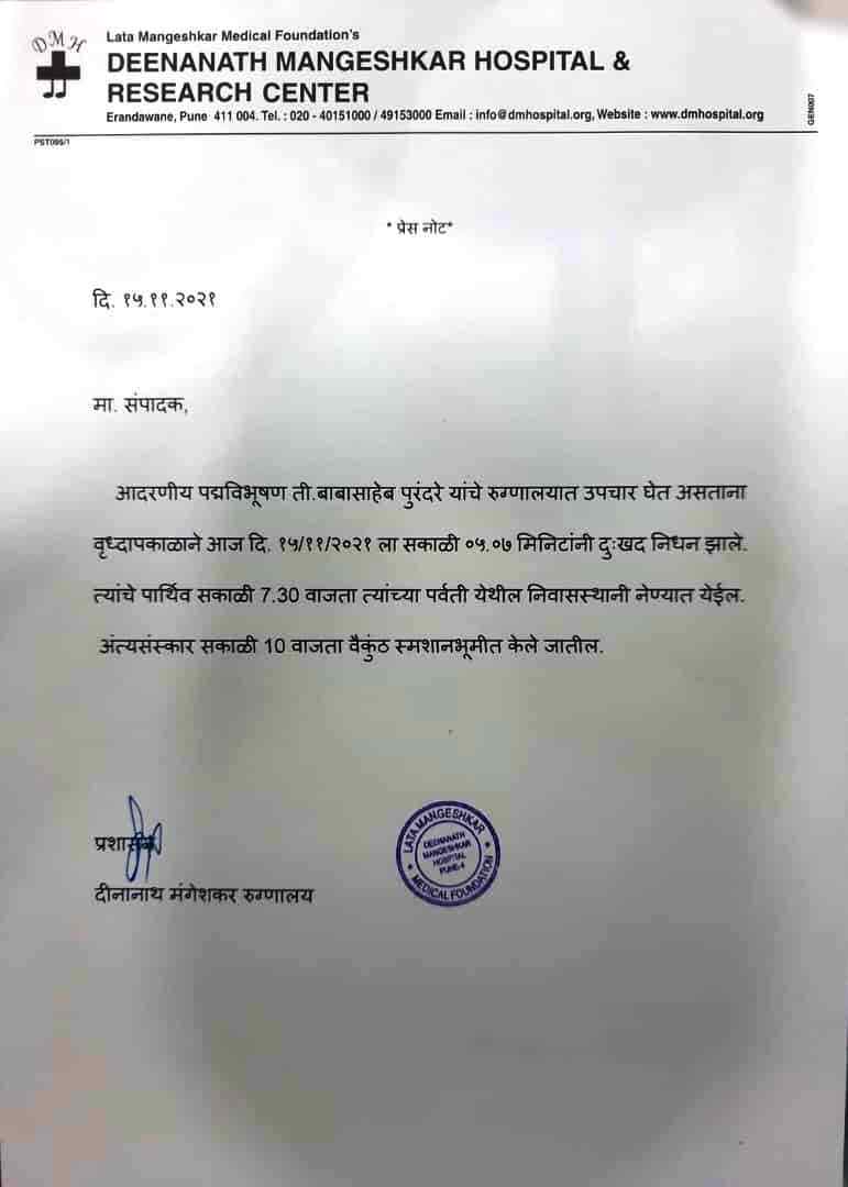 रुग्णालयाने जारी केलेल्या पत्रकानुसार पहाटे ५ वाजून ७ मिनिटांनी बाबासाहेबांचं निधन झालं. “आदरणीय पद्मविभूषण बाबासाहेब पुरंदरे यांचे रुग्णालयात उपचार घेत असताना वृद्धापकाळाने आज दिनांक १५ नोव्हेंबर २०२१ रोजी सकाळी ५ वाजून ०७ मिनिटांनी दु:खद निधन झाले. त्यांचे पार्थिव सकाळी ७ वाजून ३० मिनिटांनी त्यांच्या पर्वती येथील निवासस्थानी नेण्यात येईल. अंत्यसंस्कार सकाळी १० वाजता वैकुंठ स्मशानभूमीत केले जातील,” असं दिनानाथ मंगेशकर रुग्णालयाने जारी केलेल्या पत्रकात म्हटलंय. आपल्या ओजस्वी वाणीने शिवचरित्र घराघरांत पोहोचविणारे, ‘राजा शिवछत्रपती’ या ग्रंथाचे लेखक, ‘जाणता राजा’ या महानाटय़ाचे लेखक-दिग्दर्शक शिवशाहीर महाराष्ट्रभूषण बळवंत