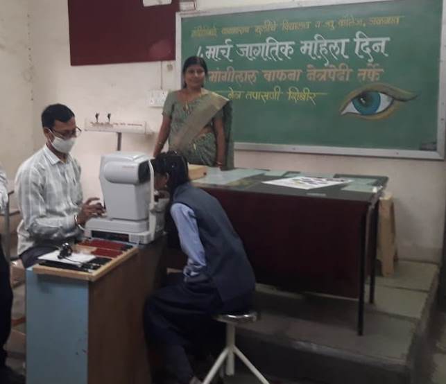 जळगाव (प्रतिनिधी) – केशवस्मृती प्रतिष्ठान व आर. सी. बाफना फाऊंडेशन संचलित मांगिलालजी बाफना नेत्रपेढीच्या वतीने जागतिक महिला दिनाचे औचित्य साधत शहरातील नंदिनीबाई वामनराव मुलीचे विद्यालय व ज्यु. कॉलेज येथे मोफत नेत्रतपासणी शिबिराचे आयोजन करण्यात आले होते. शिबिराचे उद्घाटन प्राचार्या चारुलता पाटील यांचे हस्ते झाले. यावेळी ८५ विद्यार्थीनींची नेत्र तपासणी करण्यात आली. शिबिर यशस्वीतेसाठी विद्यालयाचे सुनिल चोपडे, प्रदिप वाणी बाफना नेत्रपेढीचे किरण तोडकरी, ईश्वर महाजन, गौरव तायडे यांचे सहकार्य लाभले.