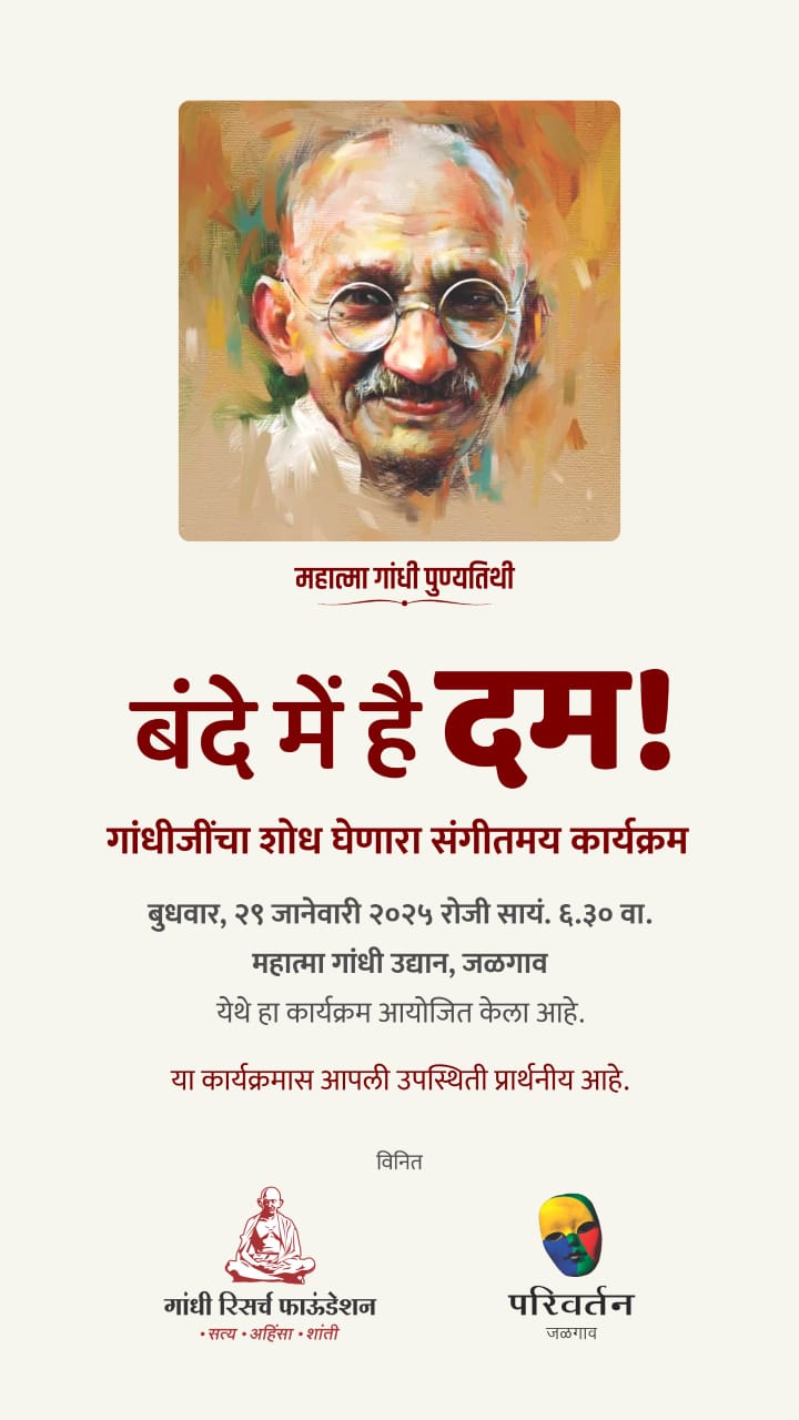 जळगाव – महात्मा गांधी यांच्या पुण्यतिथी निमित्त पूर्व संध्येला गांधी रिसर्च फाऊंडेशन आयोजित व परिवर्तन जळगाव निर्मित ‘बंदे में हे दम’ हा संगीतमय कार्यक्रम महात्मा गांधी उद्यान येथे आज दि. २९ रोजी संध्याकाळी ६.३० वाजता सादर होणार आहे.