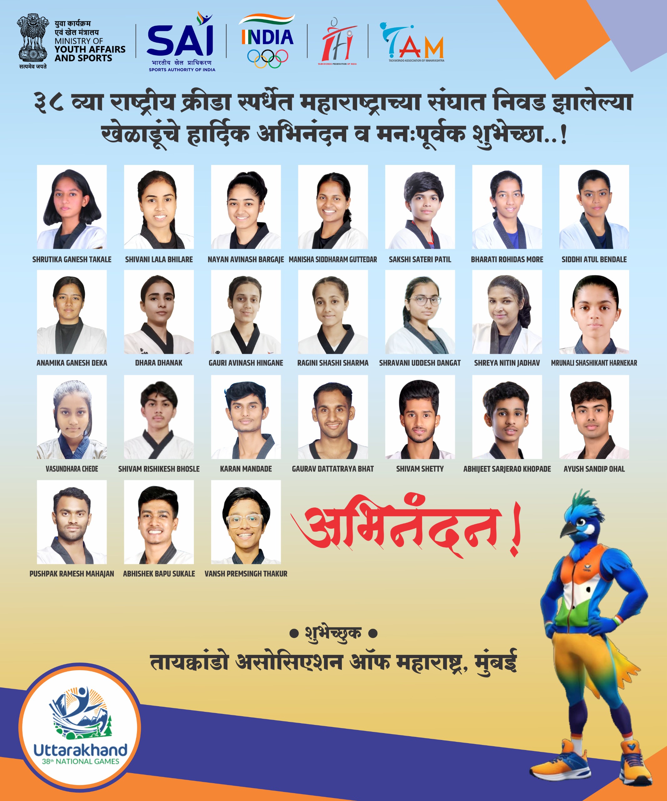 जळगांव – इंडियन ऑलिंपिक असोसिएशन तथा उत्तराखंड ऑलिंपिक असोसिएशन द्वारा आयोजित ३८ व्या राष्ट्रीय क्रीडा स्पर्धेसाठी तायक्वांदो असोशिएशन ॲाफ महाराष्ट्र , मुंबई संघटनेचे २४ खेळाडू महाराष्ट्र राज्याचे नेतृत्व करणार असल्याचे ‘ताम‘ राज्य संघटनेचे महासचिव श्री मिलिंद पठारे यांनी सांगितले.
