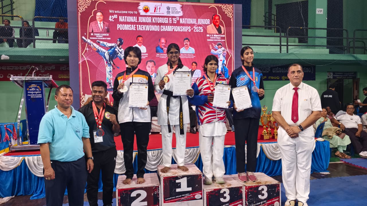 जळगांव – दिनांक ३१ ऑक्टोबर ते २ नोव्हेंबर २०२५ रोजी राजीव गांधी इनडोअर स्टेडियम, बॅगंलोर येथे सुरू असलेल्या ४२ व्या राष्ट्रीय ज्युनिअर क्युरोगी आणि १५ वी पुमसे स्पर्धेत जळगांव जिल्हा तायक्वांडो असोसिएशन तथा जैन स्पोर्टस् अकॅडमी ची खेळाडू कु. निकिता दिलीप पवार हिने ५५ किलो आतिल वजन गटात सुवर्णपदक पटकावले आहे तिने पहिल्या फेरीत कर्नाटकच्या मोनिषा एस., दुसऱ्या फेरीत केरळची अवंतिका व्हि. तिसऱ्या फेरीत मध्य प्रदेश ची अस्मी भारती हिचा पराभव करून अंतिम फेरीत मध्ये आसाम ची खेळाडू व्हिएना हजारिका हिला नमवत सुवर्णपदकावर आपले नांव कोरले.