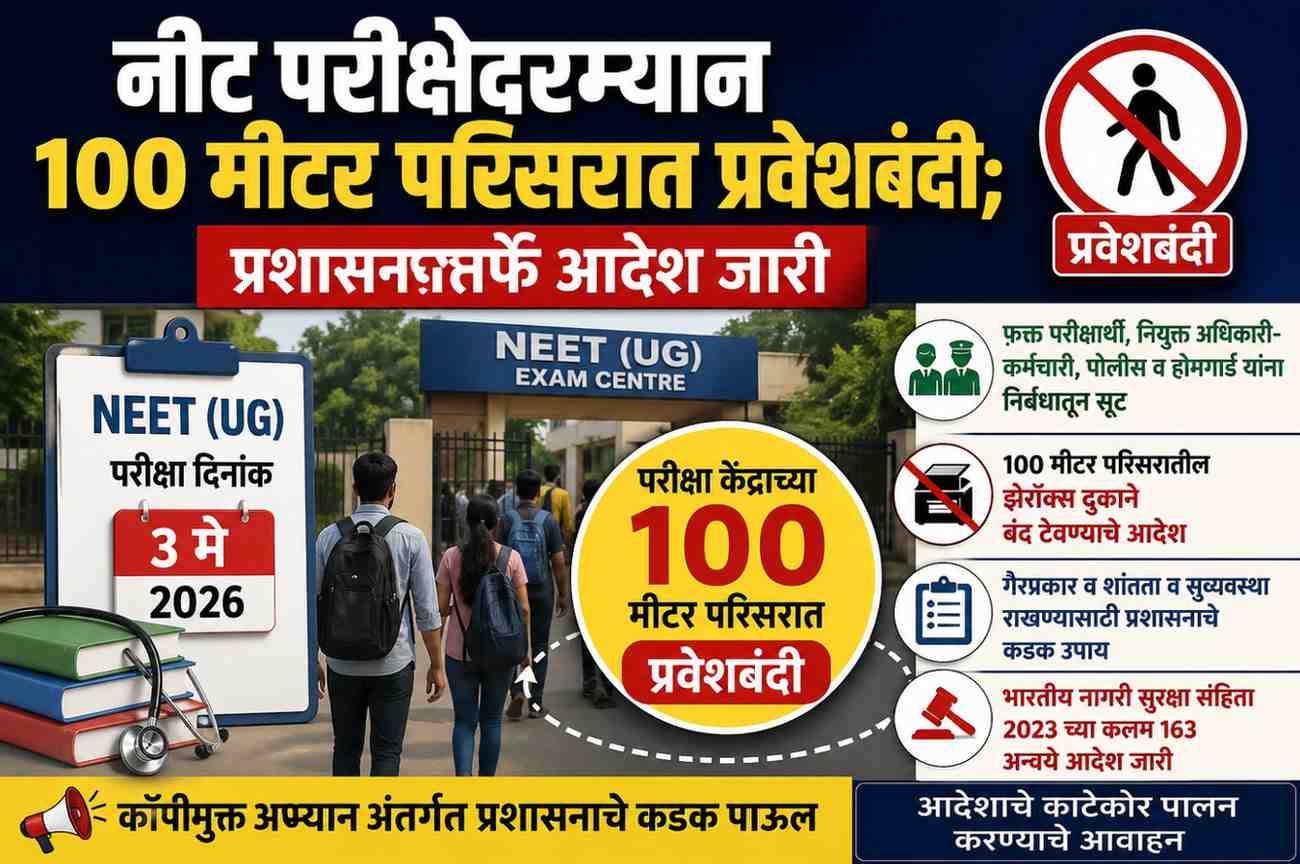 जळगाव, दि. 29 एप्रिल – नीट (यूजी) परीक्षा दिनांक ३ मे २०२६ रोजी होणार असून परीक्षेदरम्यान कोणतेही गैरप्रकार होऊ नयेत यासाठी प्रशासनाने कडक उपाययोजना लागू केल्या आहेत. जिल्ह्यातील सर्व परीक्षा केंद्रांवर “कॉपीमुक्त अभियान” राबविण्यात येणार आहे.